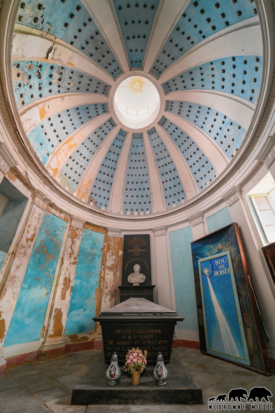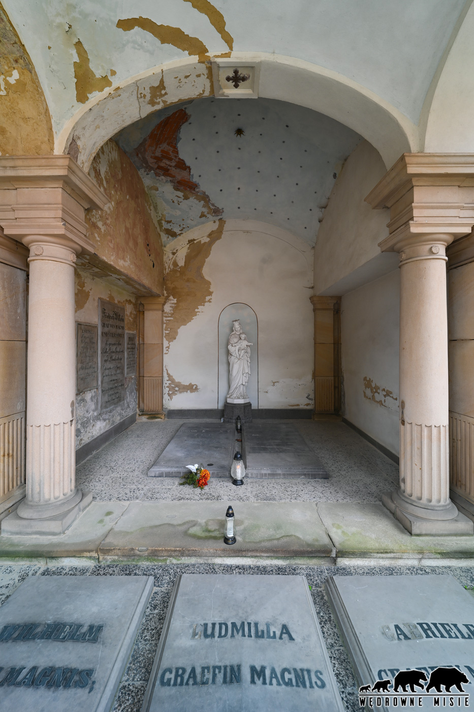 Figury strzegących wejścia aniołów są tak przejmujące, że przekraczając cmentarną furtkę nie sposób od razu nie ulec atmosferze miejsca. Wprost trzeba podziwiać kunszt twórców, ale i uszanować spokój spoczywających tu rodowych przodków. W krypcie znajdują się sarkofagi samego zmarłego w 1944 r. fundatora, jego siostry i siostrzenicy. Po II wojnie światowej rodzina przeniosła się na zachód, a mauzoleum przejęła polska parafia. Wykorzystywano je jako składzik i salę katechetyczną. Jeszcze niedawno mauzoleum dostępne było do zwiedzania, ale obecnie (zima 2025) nie ma takiej możliwości. Trzeba mieć nadzieję, że parafii uda się pozyskać fundusze na renowację tak cennego zabytku i wkrótce będzie można podziwiać jego piękno w pełnej krasie.
